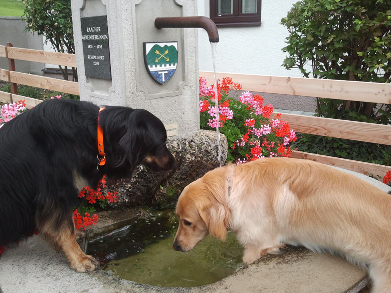 Zum Abschluss des Kurses stand eine gemeinsame Wanderung an. Nach einer Stunde stand Pfotenabkühlen im Dorfbrunnen mit Bendix neuer Flamme Akuna (Asta vom Burgblick) an. Wiener Großstadthunde sind einfach cool.