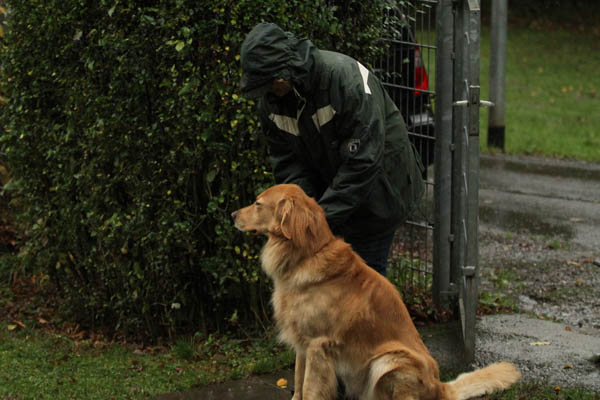... nun was soll ich sagen. Das Wetter war nur Sch.... Zu Beginn der Fährte hatte es angefangen zu regnen und unsere Prüfung ging im wahrsten Sinne des Wortes im Regen unter. Die Fährtenhunde kämpften sich über den Acker und alle waren froh am letzten Gegenstand angekommen zu sein. Die Begleithunde legten auch eine Art von Kreativität an den Tag und mir quetschte sich der Matsch auf dem Platz durch die Pfoten, Frauchen ging es auch nicht besser, sie war zu diesem Zeitpunkt auch schon nass bis auf Haut und hatte mit der Bodenhaftung sehr zu kämpfen. Ihhhhhh - Fuß laufen kann ich ja wirklich toll - aber heute sah man mir meinen Widerwillen deutlich an und wer will schon die ganze Zeit Wasser in die Augen bekommen. Sitz und Platz habe ich verschusselt und durch ein perfektes Steh und Sitz abgeändert. Apport auf ebener Erde, über die Hürde und Schrägwand war in Ordnung nur das Voraus habe ich bis heute nicht begriffen. Nun 65 Punkte sind das Ergebnis - na ja kein Beinbruch. Dafür haben wir 94 in der Fährte abgeräumt. Im Frühling wird alles Besser und das Voraus kapiere ich auch noch.