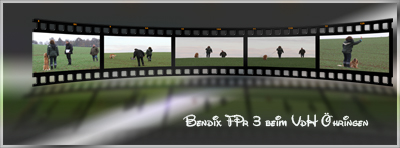 Nach ein paar Trainingseinheiten habe ich mich entschlossen, die FH 1 mit Bendix anzugehen. Mit ein bisschen Nervosität setzte ich Bendix zur Fährte an und schon ging es los. Die erste Gerade zog sich ewig hin und wollte gar nicht aufhören, als der erste Winkel kam, machte sich Erleichterung breit, auch wenn es nicht der Tatsache entspricht, aber ich hatte einfach das Gefühl, nun geht es zurück. Der vom Leistungsrichter Alfred "Freddy" Hauck geforderte Geländewechsel brachte Bendix ein bisschen aus dem Rhythmus aber nachdem der nächste Winkel gemeistert war, ging es in seinem gewohnten Suchtempo, bis zum Ende der Fährte. Der Leistungsrichter bescheinigte ihm eine vorzügliche Fährtenarbeit und vergab 96 Punkte.