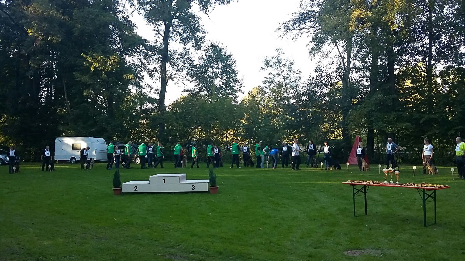 Die hatten wir so gar nicht mehr auf dem Schirm und da wir uns in diesem Sommer mehr auf das Obediencetraining konzentriert hatten, war das Fährtentraining zu kurz gekommen. Mitte September hatten wir wieder mit der Fährte angefangen und 2 1/2 Wochen vor der Verbandsmeisterschaft kam der Brief mit der Einladung. Das Los hatte entschieden, wir sind dabei. Fassungslosigkeit war die Folge und nun hieß es das Beste daraus zu machen. Thomas opferte an den zwei Samstagen davor seine Zeit und legte Bendix jeweils eine längere Trainingsfährte. Meine Fährtenmädels Sonja und Gaby unterstützen uns unter der Woche und so gingen wir mit ganz viel Bauchschmerzen zu dieser Meisterschaft.