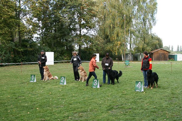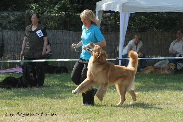 Tja, nun wird mir so langsam klar, warum Frauchen mich seit ein paar Tagen wie eine Verrückte bürstet - ich soll heute richtig schön sein. Frauchen startet mit mir in der Jugendklasse und schon wieder soll ich mich von einer fremden Frau abtasten und anfummeln lassen. Ich bin ja ein sehr freundlicher Rüde und lasse alles ohne murren und knurren über mich ergehen und wenn Frauchen anfängt zu rennen, renne ich einfach mit. Nachdem wir alle lange lange warten mussten, denn unsere Richterin war sehr gründlich, durften wir endlich nochmals ein paar Runden rennen und bei dieser Hitze bin ich dann halt ein bisschen Pass gelaufen und somit stand bald fest wir hatten uns den dritten Platz gesichert. So für den Anfang ist das doch richtig gut und Frauchen war mit mir auch sehr sehr sehr zufrieden.